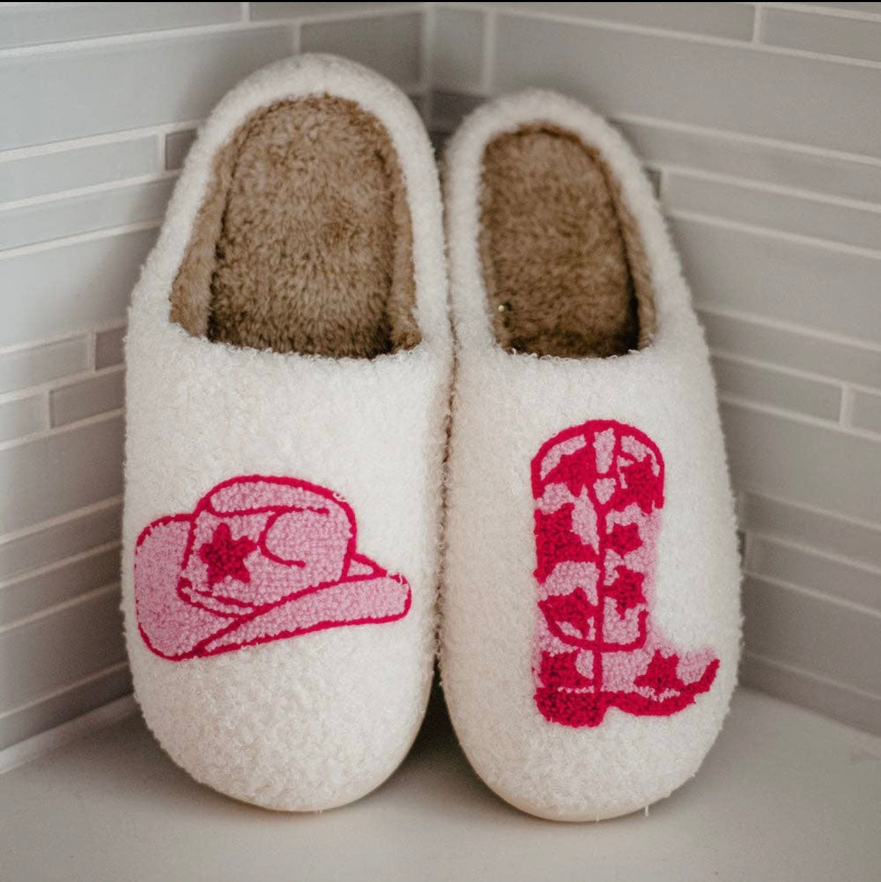 These slippers are so cozy! They're made of a soft, fuzzy material with close-toed toes and rubber soles.